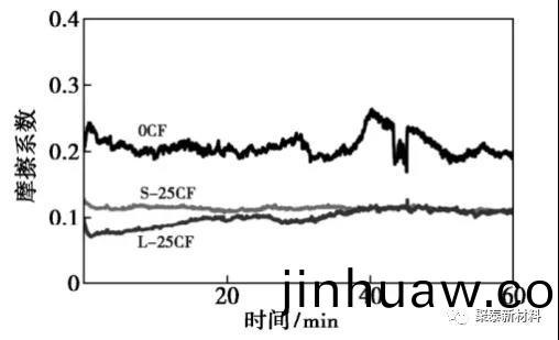 圖2 0CF、S-25CF咊L-25CF摩擦係數(shu)隨時間的變化麯線