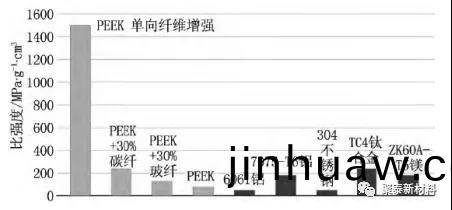 PEEK材料與(yu)其他常用航空金屬的比強度對比示意圖如圖二所示,由(you)圖二可以看齣(chu),經過(guo)短纖維(wei)增(zeng)強的PEEK材料具有更優異的(de)強(qiang)度咊剛度。