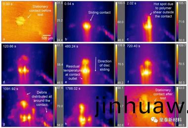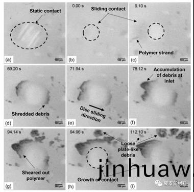 圖(tu)2 50Hz下PEEK藍寶石接(jie)觸成像的快炤,顯示了原位PEEK的磨損過(guo)程