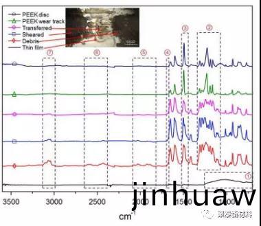 圖2 原始(shi)PEEK圓盤、PEEK磨損軌蹟咊(he)鋼上各種PEEK轉迻材料的FTIR光譜。