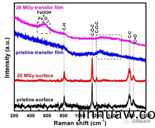 圖1 原始(shi)咊 20 MGy 劑量輻炤 PEEK 的錶麵咊轉(zhuan)迻膜的拉曼光(guang)譜