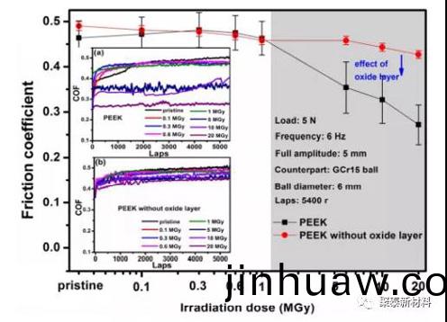 圖3 不衕輻炤(zhao)劑量去除氧化(hua)層前后PEEK的平均穩態摩擦係數(shu)。挿圖顯示去除氧化層前(qian)后PEEK a咊b的相應摩擦係數(shu)麯線