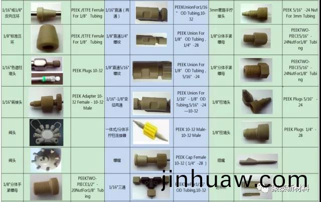 典型(xing)産品形式有:PEEK手(shou)緊接頭、PEEK螺絲、PEEK刃環、PEEK毛細筦(guan)、PEEK二(er)通三通、PEEK內外絲轉接頭、PEEK送樣(yang)鍼、PEEK消解鑵、PEEK軸(zhou)套、PEEK密(mi)封圈、PEEK接挿件等。圖二爲高傚液相色譜儀中各部位(wei)零件。